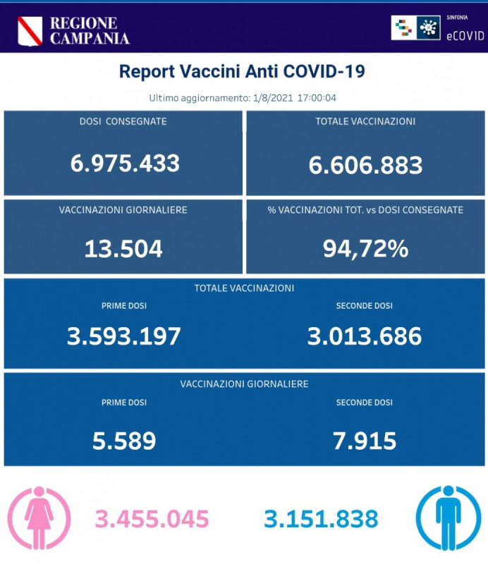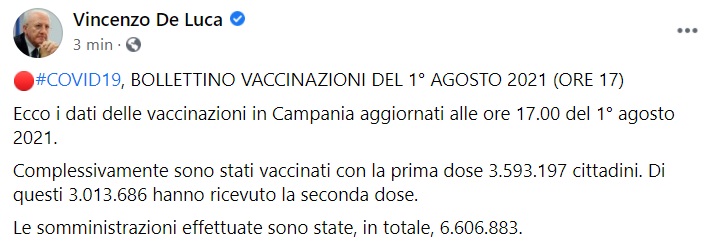 Questo quanto apprendiamo dalla pagina fb del Pres. De Luca: "COVID19, BOLLETTINO VACCINAZIONI DEL 1° AGOSTO 2021 (ORE 17) Ecco i dati delle vaccinazioni in Campania aggiornati alle ore 17.00 del 1° agosto 2021. Complessivamente sono stati vaccinati con la prima dose 3.593.197 cittadini. Di questi 3.013.686 hanno ricevuto la seconda dose. Le somministrazioni effettuate sono state, in totale, 6.606.883."