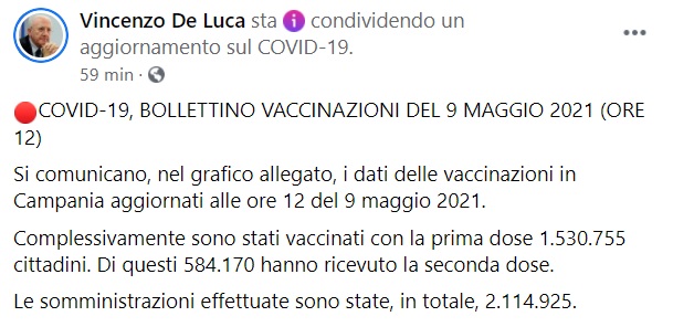 "COVID-19, BOLLETTINO VACCINAZIONI DEL 9 MAGGIO 2021 (ORE 12). Si comunicano, nel grafico allegato, i dati delle vaccinazioni in Campania aggiornati alle ore 12 del 9 maggio 2021. Complessivamente sono stati vaccinati con la prima dose 1.530.755 cittadini. Di questi- si legge nella nota- 584.170 hanno ricevuto la seconda dose. Le somministrazioni effettuate sono state, in totale, 2.114.925."