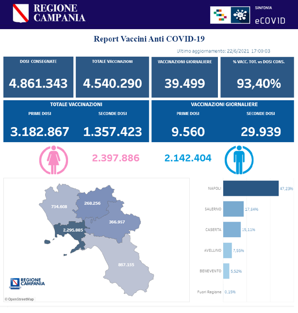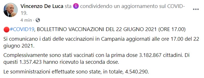 Questo quanto apprendiamo dalla pagina fb del Pres. De Luca: "COVID19, BOLLETTINO VACCINAZIONI DEL 22 GIUGNO 2021 (ORE 17.00) Si comunicano i dati delle vaccinazioni in Campania aggiornati alle ore 17.00 del 22 giugno 2021. Complessivamente sono stati vaccinati con la prima dose 3.182.867 cittadini. Di questi 1.357.423 hanno ricevuto la seconda dose. Le somministrazioni effettuate sono state, in totale, 4.540.290."