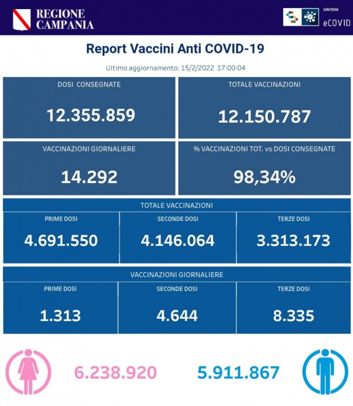 Si comunicano i dati delle vaccinazioni in Campania aggiornati alle ore 17 del 15 febbraio 2022. Complessivamente sono state effettuate 4.691.550 vaccinazioni con prima dose, 4.146.064 con seconda dose e- si legge nella nota- 3.313.173 con terza dose. Le somministrazioni sono state, in totale, 12.150.787. I dati sono disponibili al link: http://vaccinicovid19.regione.campania.it/e_vaccini-anti..."