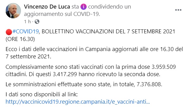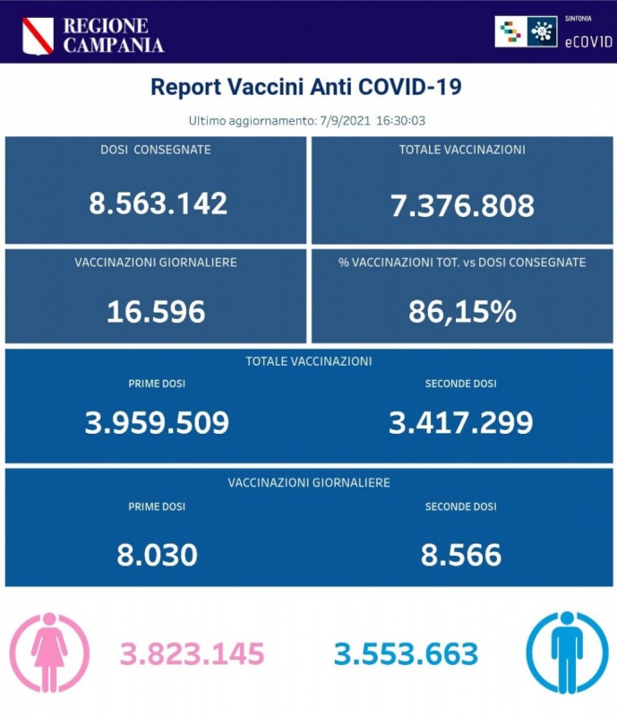 "#COVID19, BOLLETTINO VACCINAZIONI DEL 7 SETTEMBRE 2021 (ORE 16.30) Ecco i dati delle vaccinazioni in Campania aggiornati alle ore 16.30 del 7 settembre 2021. Complessivamente sono stati vaccinati con la prima dose 3.959.509 cittadini. Di questi- si legge nella nota- 3.417.299 hanno ricevuto la seconda dose. Le somministrazioni effettuate sono state, in totale, 7.376.808."