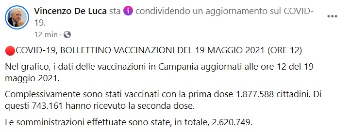 "COVID-19, BOLLETTINO VACCINAZIONI DEL 19 MAGGIO 2021 (ORE 12). Nel grafico, i dati delle vaccinazioni in Campania aggiornati alle ore 12 del 19 maggio 2021. Complessivamente sono stati vaccinati con la prima dose 1.877.588 cittadini. Di questi- si legge nella nota- 743.161 hanno ricevuto la seconda dose. Le somministrazioni effettuate sono state, in totale, 2.620.749."