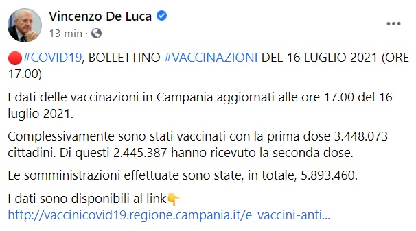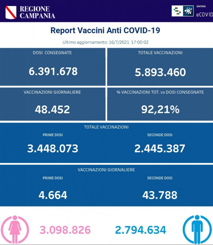 "#COVID19, BOLLETTINO #VACCINAZIONI DEL 16 LUGLIO 2021 (ORE 17.00). I dati delle vaccinazioni in Campania aggiornati alle ore 17.00 del 16 luglio 2021. Complessivamente sono stati vaccinati con la prima dose 3.448.073 cittadini. Di questi- si legge nella nota- 2.445.387 hanno ricevuto la seconda dose. Le somministrazioni effettuate sono state, in totale, 5.893.460"