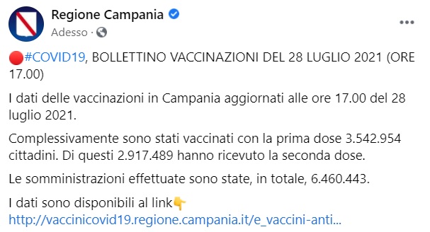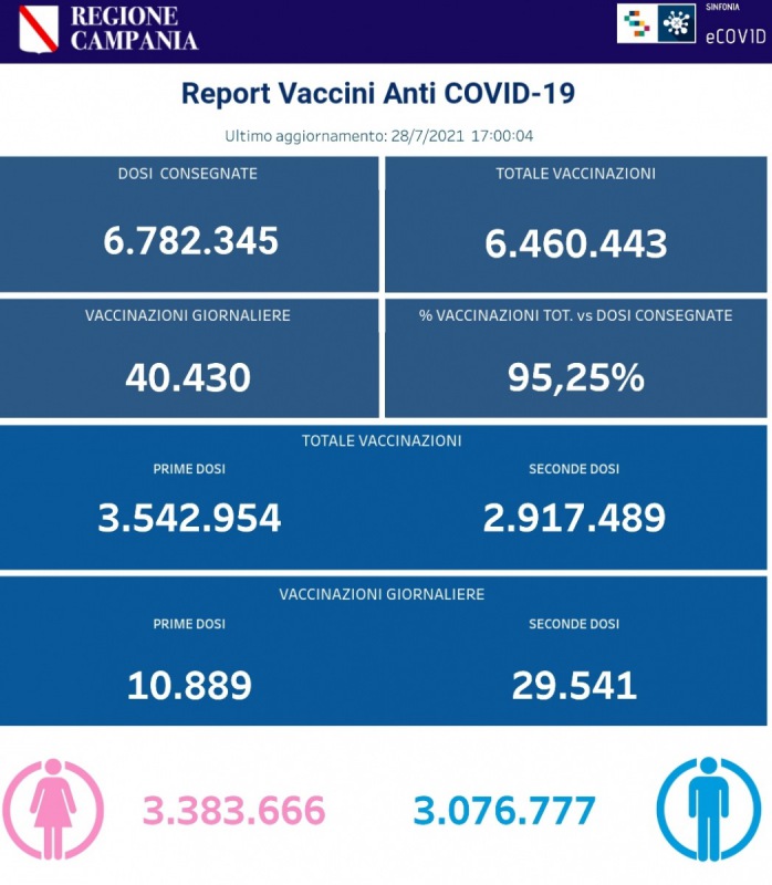 "#COVID19, BOLLETTINO VACCINAZIONI DEL 28 LUGLIO 2021 (ORE 17.00) I dati delle vaccinazioni in Campania aggiornati alle ore 17.00 del 28 luglio 2021. Complessivamente sono stati vaccinati con la prima dose 3.542.954 cittadini. Di questi- si legge nella nota- 2.917.489 hanno ricevuto la seconda dose. Le somministrazioni effettuate sono state, in totale, 6.460.443."