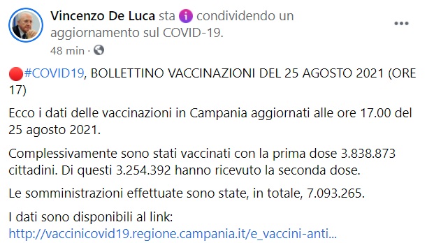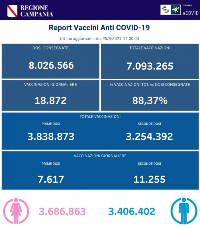 "#COVID19, BOLLETTINO VACCINAZIONI DEL 25 AGOSTO 2021 (ORE 17). Ecco i dati delle vaccinazioni in Campania aggiornati alle ore 17.00 del 25 agosto 2021. Complessivamente sono stati vaccinati con la prima dose 3.838.873 cittadini. Di questi- si legge nella nota- 3.254.392 hanno ricevuto la seconda dose. Le somministrazioni effettuate sono state, in totale, 7.093.265."