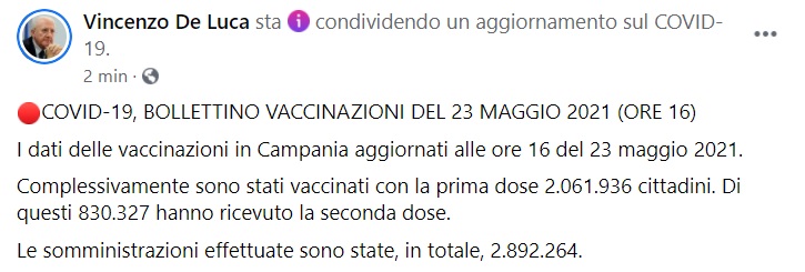 "COVID-19, BOLLETTINO VACCINAZIONI DEL 23 MAGGIO 2021 (ORE 16). I dati delle vaccinazioni in Campania aggiornati alle ore 16 del 23 maggio 2021. Complessivamente sono stati vaccinati con la prima dose 2.061.936 cittadini. Di questi- si legge nella nota- 830.327 hanno ricevuto la seconda dose. Le somministrazioni effettuate sono state, in totale, 2.892.264."