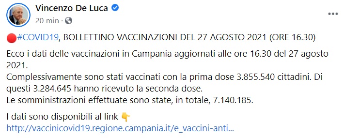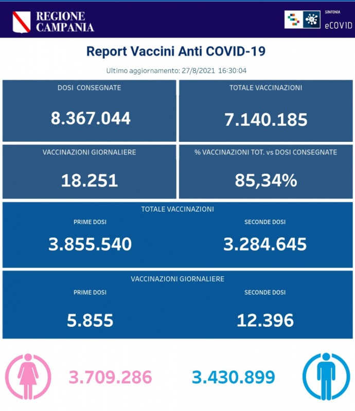 "#COVID19, BOLLETTINO VACCINAZIONI DEL 27 AGOSTO 2021 (ORE 16.30). Ecco i dati delle vaccinazioni in Campania aggiornati alle ore 16.30 del 27 agosto 2021. Complessivamente sono stati vaccinati con la prima dose 3.855.540 cittadini. Di questi- si legge nella nota- 3.284.645 hanno ricevuto la seconda dose. Le somministrazioni effettuate sono state, in totale, 7.140.185."