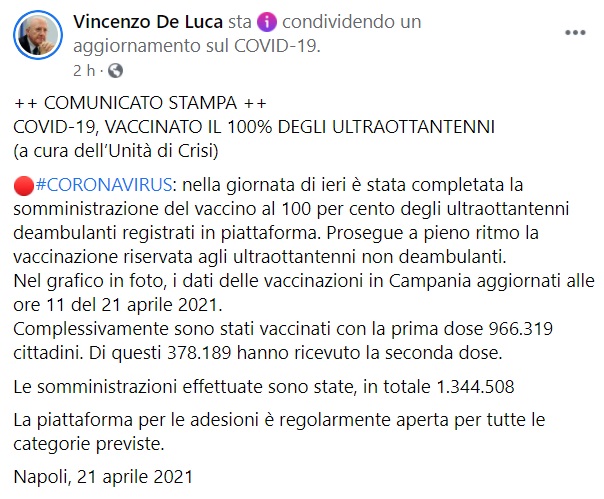 "++ COMUNICATO STAMPA ++ COVID-19, VACCINATO IL 100% DEGLI ULTRAOTTANTENNI (a cura dell’Unità di Crisi). #CORONAVIRUS: nella giornata di ieri è stata completata la somministrazione del vaccino al 100 per cento degli ultraottantenni deambulanti registrati in piattaforma. Prosegue- si legge nella nota- a pieno ritmo la vaccinazione riservata agli ultraottantenni non deambulanti. Nel grafico in foto, i dati delle vaccinazioni in Campania aggiornati alle ore 11 del 21 aprile 2021. Complessivamente sono stati vaccinati con la prima dose 966.319 cittadini. Di questi- si legge nella nota- 378.189 hanno ricevuto la seconda dose. Le somministrazioni effettuate sono state, in totale 1.344.508 La piattaforma per le adesioni è regolarmente aperta per tutte le categorie previste."