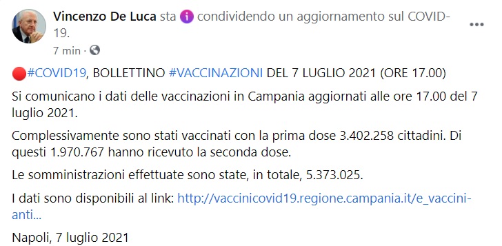 "#COVID19, BOLLETTINO #VACCINAZIONI DEL 7 LUGLIO 2021 (ORE 17.00). Si comunicano i dati delle vaccinazioni in Campania aggiornati alle ore 17.00 del 7 luglio 2021. Complessivamente sono stati vaccinati con la prima dose 3.402.258 cittadini. Di questi- si legge nella nota- 1.970.767 hanno ricevuto la seconda dose. Le somministrazioni effettuate sono state, in totale, 5.373.025."