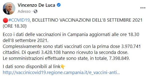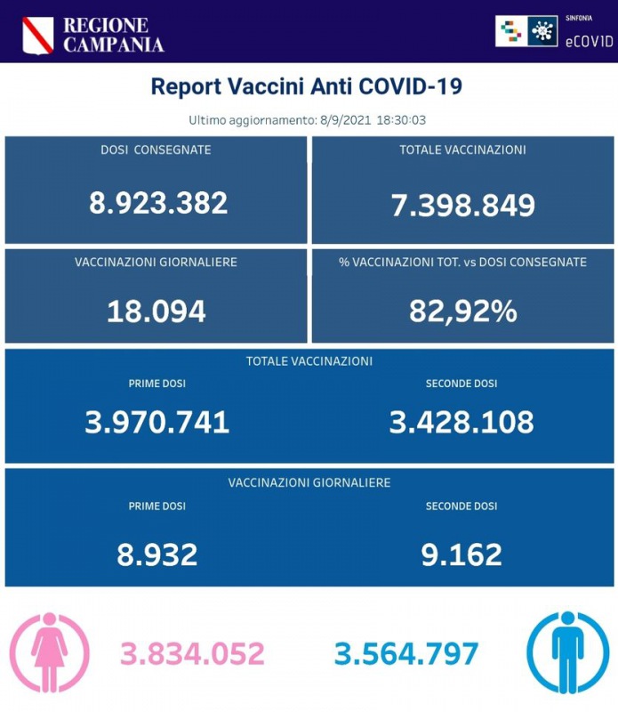 "#COVID19, BOLLETTINO VACCINAZIONI DELL'8 SETTEMBRE 2021 (ORE 18.30) Ecco i dati delle vaccinazioni in Campania aggiornati alle ore 18.30 dell'8 settembre 2021. Complessivamente sono stati vaccinati con la prima dose 3.970.741 cittadini. Di questi- si legge nella nota- 3.428.108 hanno ricevuto la seconda dose. Le somministrazioni effettuate sono state, in totale, 7.398.849."