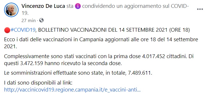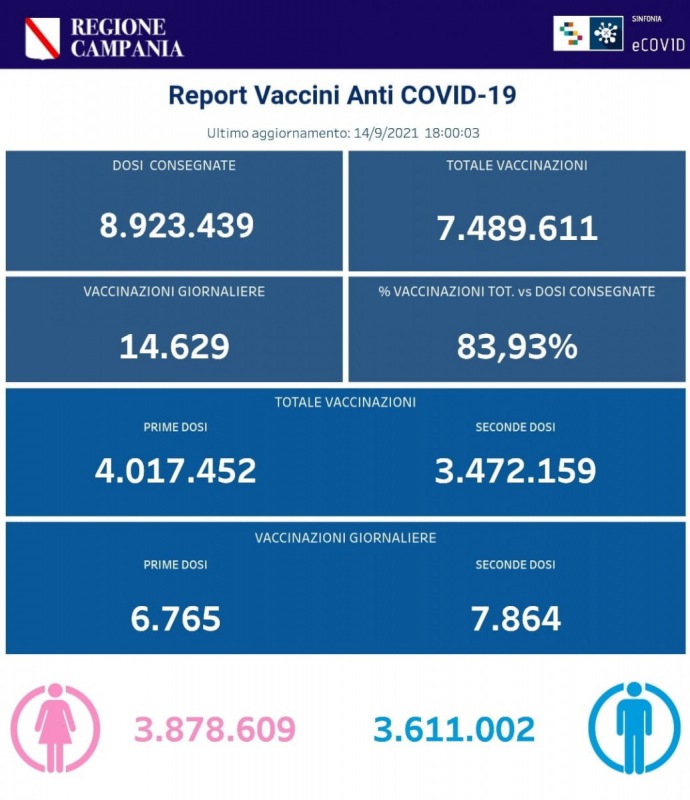 "#COVID19, BOLLETTINO VACCINAZIONI DEL 14 SETTEMBRE 2021 (ORE 18). Ecco i dati delle vaccinazioni in Campania aggiornati alle ore 18 del 14 settembre 2021. Complessivamente sono stati vaccinati con la prima dose 4.017.452 cittadini. Di questi- si legge nella nota- 3.472.159 hanno ricevuto la seconda dose. Le somministrazioni effettuate sono state, in totale, 7.489.611."