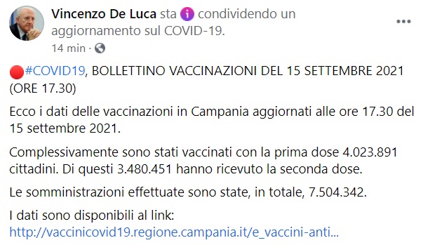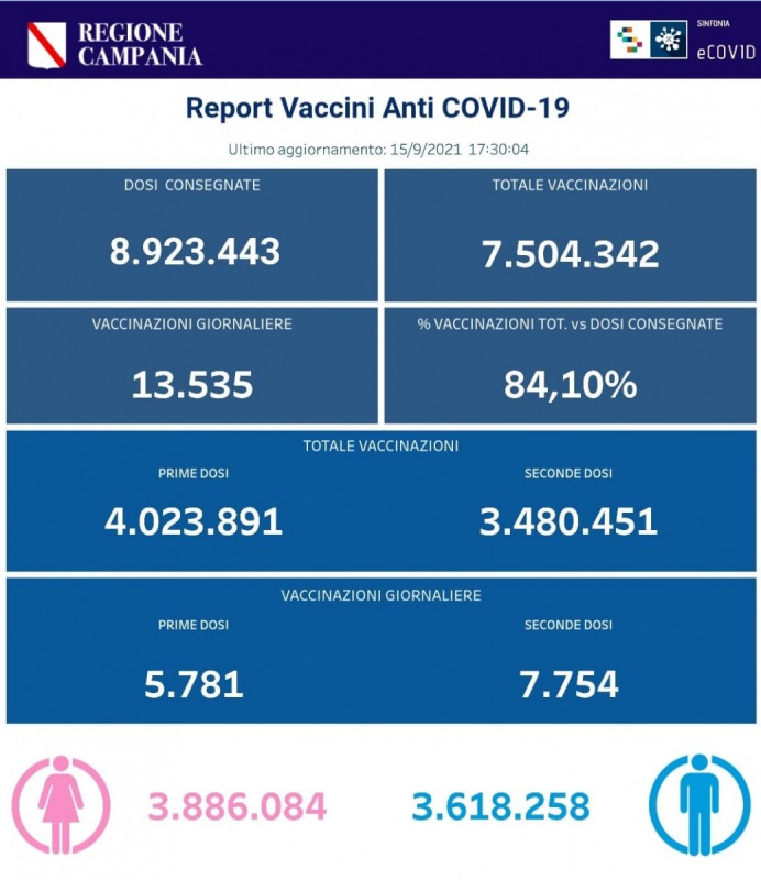 "#COVID19, BOLLETTINO VACCINAZIONI DEL 15 SETTEMBRE 2021 (ORE 17.30). Ecco i dati delle vaccinazioni in Campania aggiornati alle ore 17.30 del 15 settembre 2021. Complessivamente sono stati vaccinati con la prima dose 4.023.891 cittadini. Di questi- si legge nella nota- 3.480.451 hanno ricevuto la seconda dose. Le somministrazioni effettuate sono state, in totale, 7.504.342."