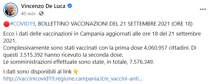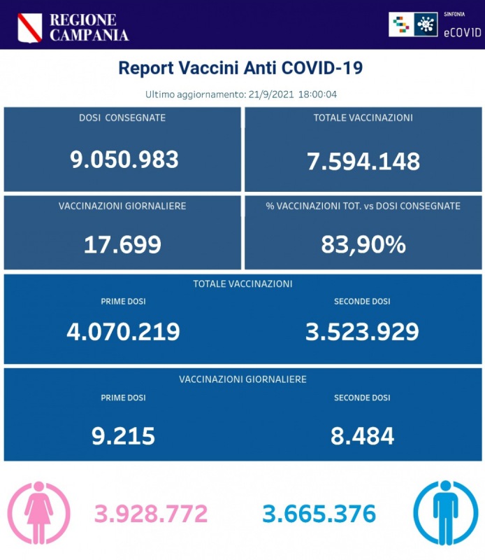 "#COVID19, BOLLETTINO VACCINAZIONI DEL 21 SETTEMBRE 2021 (ORE 18). Ecco i dati delle vaccinazioni in Campania aggiornati alle ore 18 del 21 settembre 2021. Complessivamente sono stati vaccinati con la prima dose 4.060.957 cittadini. Di questi- si legge nella nota- 3.515.392 hanno ricevuto la seconda dose. Le somministrazioni effettuate sono state, in totale, 7.576.349."