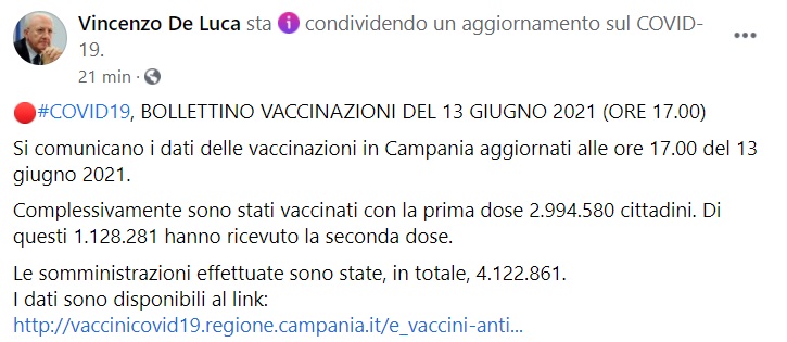 "#COVID19, BOLLETTINO VACCINAZIONI DEL 13 GIUGNO 2021 (ORE 17.00). Si comunicano i dati delle vaccinazioni in Campania aggiornati alle ore 17.00 del 13 giugno 2021. Complessivamente sono stati vaccinati con la prima dose 2.994.580 cittadini. Di questi- si legge nella nota- 1.128.281 hanno ricevuto la seconda dose. Le somministrazioni effettuate sono state, in totale, 4.122.861."