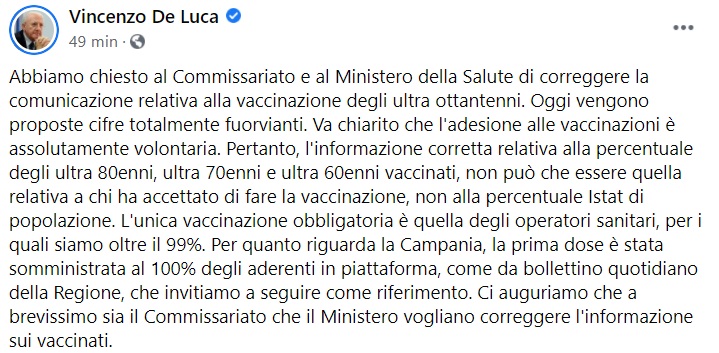 Questo quanto pubblicato sulla pagina fb del Pres. De Luca: "Abbiamo chiesto al Commissariato e al Ministero della Salute di correggere la comunicazione relativa alla vaccinazione degli ultra ottantenni. Oggi vengono proposte cifre totalmente fuorvianti - si legge nella nota -. Va chiarito che l'adesione alle vaccinazioni è assolutamente volontaria. Pertanto, l'informazione corretta relativa alla percentuale degli ultra 80enni, ultra 70enni e ultra 60enni vaccinati, non può che essere quella relativa a chi ha accettato di fare la vaccinazione, non alla percentuale Istat di popolazione. L'unica vaccinazione obbligatoria è quella degli operatori sanitari, per i quali siamo oltre il 99%. Per quanto riguarda la Campania - si legge nella nota -, la prima dose è stata somministrata al 100% degli aderenti in piattaforma, come da bollettino quotidiano della Regione, che invitiamo a seguire come riferimento. Ci auguriamo che a brevissimo sia il Commissariato che il Ministero vogliano correggere l'informazione sui vaccinati."
