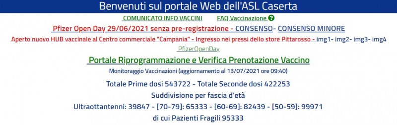 Vaccinazioni Prov. Ce. Poco meno di 544mila prime dosi somministrate, i dettagli