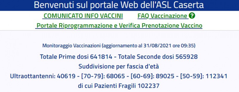 Vaccinazioni Prov. Ce. Poco meno di 642mila prime dosi somministrate