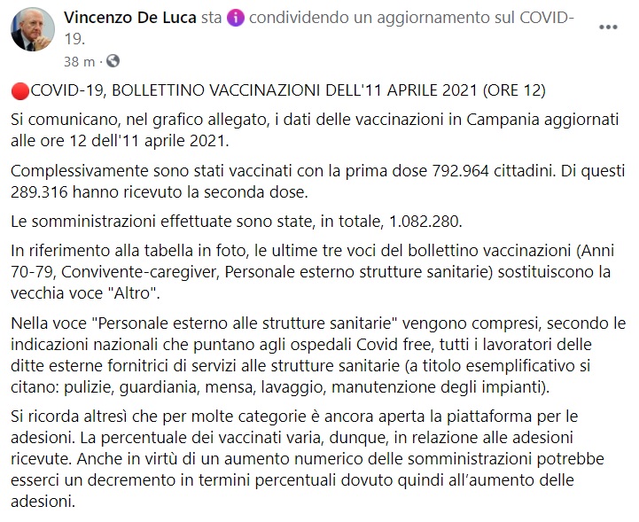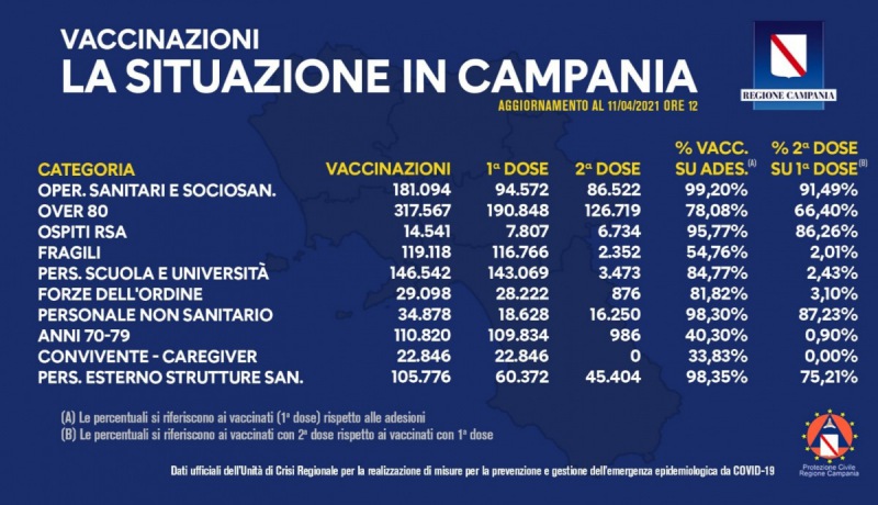 "COVID-19, BOLLETTINO VACCINAZIONI DELL'11 APRILE 2021 (ORE 12). Si comunicano, nel grafico allegato, i dati delle vaccinazioni in Campania aggiornati alle ore 12 dell'11 aprile 2021. Complessivamente sono stati vaccinati con la prima dose 792.964 cittadini. Di questi 289.316 hanno ricevuto la seconda dose. Le somministrazioni effettuate- si legge nella nota- sono state, in totale, 1.082.280. In riferimento alla tabella in foto, le ultime tre voci del bollettino vaccinazioni (Anni 70-79, Convivente-caregiver, Personale esterno strutture sanitarie) sostituiscono la vecchia voce "Altro". Nella voce "Personale esterno alle strutture sanitarie" vengono compresi, secondo le indicazioni nazionali che puntano agli ospedali Covid free, tutti i lavoratori delle ditte esterne fornitrici di servizi alle strutture sanitarie (a titolo esemplificativo si citano: pulizie, guardiania, mensa, lavaggio, manutenzione degli impianti). Si ricorda altresì- si legge nella nota- che per molte categorie è ancora aperta la piattaforma per le adesioni. La percentuale dei vaccinati varia, dunque, in relazione alle adesioni ricevute. Anche in virtù di un aumento numerico delle somministrazioni potrebbe esserci un decremento in termini percentuali dovuto quindi all’aumento delle adesioni."