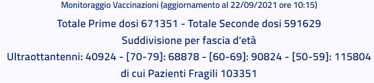 Questo quanto apprendiamo dall'ASL CE: "Monitoraggio Vaccinazioni (aggiornamento al 22/09/2021 ore 10:15) Totale Prime dosi 671351 - Totale Seconde dosi 591629 Suddivisione per fascia d'età Ultraottantenni: 40924 - [70-79]: 68878 - [60-69]: 90824 - [50-59]: 115804 di cui Pazienti Fragili 103351"