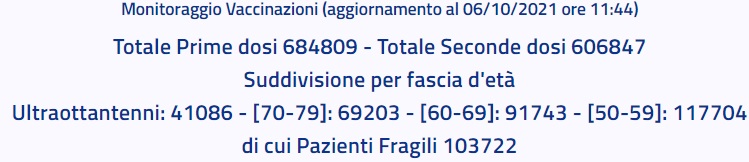 Questo quanto apprendiamo dall'ASL CE: Monitoraggio Vaccinazioni (aggiornamento al 06/10/2021 ore 11:44) Totale Prime dosi 684809 - Totale Seconde dosi 606847 Suddivisione per fascia d'età Ultraottantenni: 41086 - [70-79]: 69203 - [60-69]: 91743 - [50-59]: 117704 di cui Pazienti Fragili 103722"
