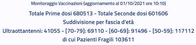 Questo quanto apprendiamo dall'ASL CE: "Monitoraggio Vaccinazioni (aggiornamento al 01/10/2021 ore 10:10) Totale Prime dosi 680513 - Totale Seconde dosi 601606 Suddivisione per fascia d'età Ultraottantenni: 41055 - [70-79]: 69110 - [60-69]: 91496 - [50-59]: 117112 di cui Pazienti Fragili 103611"