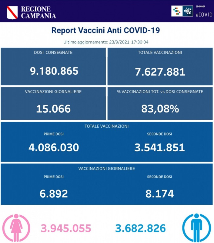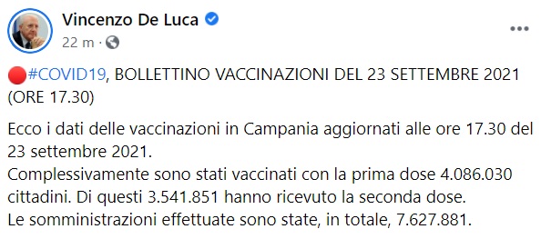 Questo quanto apprendiamo dalla pagina fb del Pres. De Luca: "COVID19, BOLLETTINO VACCINAZIONI DEL 23 SETTEMBRE 2021 (ORE 17.30) Ecco i dati delle vaccinazioni in Campania aggiornati alle ore 17.30 del 23 settembre 2021. Complessivamente sono stati vaccinati con la prima dose 4.086.030 cittadini. Di questi 3.541.851 hanno ricevuto la seconda dose. Le somministrazioni effettuate sono state, in totale, 7.627.881."