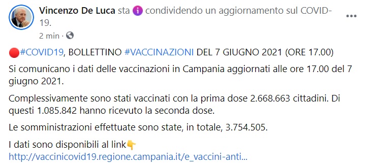 Questo quanto pubblicato sulla pagina facebook del Pres. De Luca: