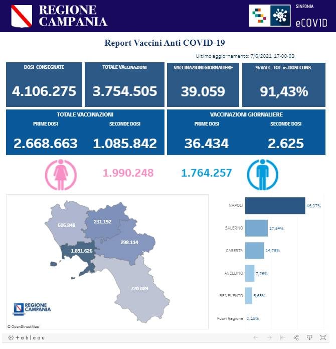 "Si comunicano i dati delle vaccinazioni in Campania aggiornati alle ore 17.00 del 7 giugno 2021. Complessivamente sono stati vaccinati con la prima dose 2.668.663 cittadini. Di questi 1.085.842 hanno ricevuto la seconda dose. -Si legge nella nota- Le somministrazioni effettuate sono state, in totale, 3.754.505. I dati sono disponibili al link http://vaccinicovid19.regione.campania.it/e_vaccini-anti..."