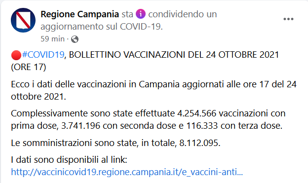 Questo il post pubblicato sulla pagina Facebook della Regione Campania: "COVID19, BOLLETTINO VACCINAZIONI DEL 24 OTTOBRE 2021 (ORE 17) Ecco i dati delle vaccinazioni in Campania aggiornati alle ore 17 del 24 ottobre 2021. Complessivamente - si legge nel post - sono state effettuate 4.254.566 vaccinazioni con prima dose, 3.741.196 con seconda dose e 116.333 con terza dose. Le somministrazioni sono state, in totale, 8.112.095. I dati sono disponibili al link: CLICCA QUI