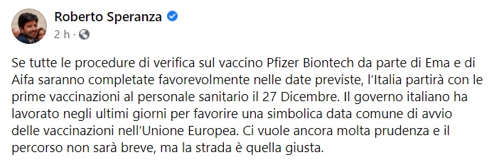 Questo quanto pubblicato sulla pagina fb del Ministro Speranza
