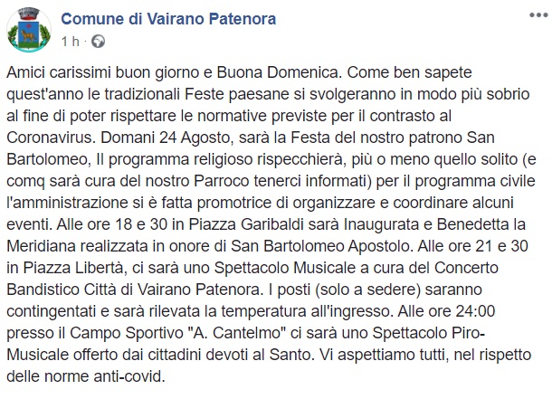 Questo quanto apprendiamo dalla pagina facebook del Comune di Vairano Patenora: