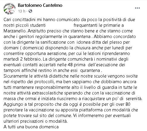 "Cari concittadini mi hanno comunicato da poco la positività di due nostri piccoli studenti ... frequentanti le primarie a Marzanello. Anzitutto preciso che stanno bene e che stanno come anche i genitori regolarmente in quarantena. Abbiamo concordato con la dirigente la sanificazione con idonea ditta del plesso per domani ( domenica) disponendo la chiusura anche per lunedì per consentire opportuna aerazione, per cui le lezioni riprenderanno martedì 2 febbraio. La dirigente comunicherà i nominativi degli eventuali contatti accertati nelle 48 prima dell'esecuzione dei tamponi affinché restino in anche essi qurantena. Sicuramente le attività didattiche nelle nostre scuole vengono svolte nel rispetto dei protocolli, ma ben sappiamo che dobbiamo ancora tutti mantenere responsabilmente alto il livello di guardia in tutte le nostre attività extrascolastiche sperando che con la vaccinazione di massa che ormai è iniziata riusciremo a riacquistare un po' di serenità. Aggiungo a tal proposito che da oggi è possibile per gli over 80 prenotare la vaccinazione su apposita piattaforma con modalità che potete trovare sul sito del comune. Vi informeremo per eventuali ulteriori precisazioni o modalità. A tutti una buona domenica".