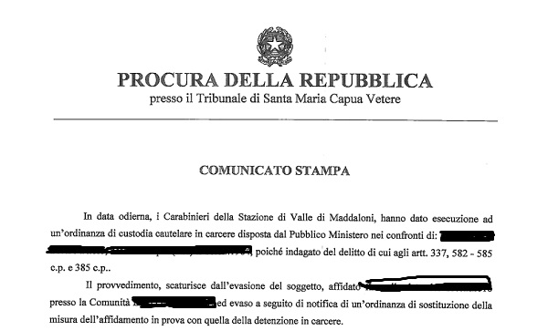 Questo parte del comunicato inviatoci dall'Ufficio della Procura della Repubblica di Santa Maria Capua Vetere.