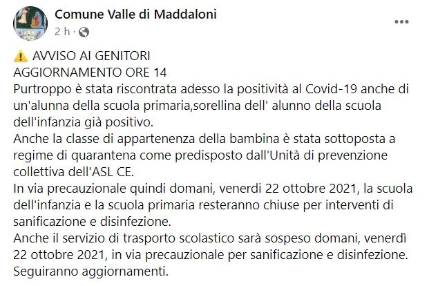 "AVVISO AI GENITORI AGGIORNAMENTO ORE 14 Purtroppo è stata riscontrata adesso la positività al Covid-19 anche di un'alunna della scuola primaria, ... Anche la classe di appartenenza della bambina è stata sottoposta a regime di quarantena come predisposto dall'Unità di prevenzione collettiva dell'ASL CE. -Si legge nella nota- In via precauzionale quindi domani, venerdi 22 ottobre 2021, la scuola dell'infanzia e la scuola primaria resteranno chiuse per interventi di sanificazione e disinfezione. Anche il servizio di trasporto scolastico sarà sospeso domani, venerdì 22 ottobre 2021, in via precauzionale per sanificazione e disinfezione. Seguiranno aggiornamenti."