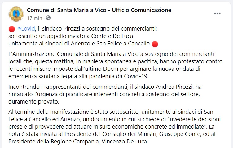 Questo quanto pubblicato sulla pagina fb del Comune di SMAV