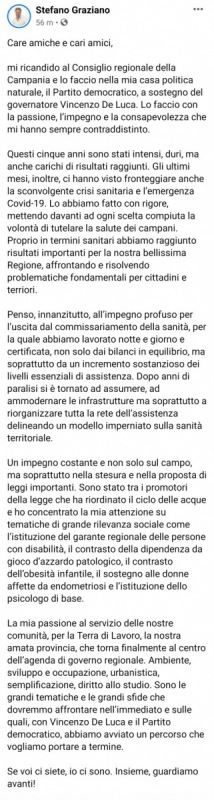 "Care amiche e cari amici, mi ricandido al Consiglio regionale della Campania e lo faccio nella mia casa politica naturale, il Partito democratico, a sostegno del governatore Vincenzo De Luca. Lo faccio con la passione, l’impegno e la consapevolezza che mi hanno sempre contraddistinto. Questi cinque anni sono stati intensi, duri, ma anche carichi di risultati raggiunti. Gli ultimi mesi, inoltre, ci hanno visto fronteggiare anche la sconvolgente crisi sanitaria e l’emergenza Covid-19. Lo abbiamo fatto con rigore, mettendo davanti ad ogni scelta compiuta la volontà di tutelare la salute dei campani. Proprio in termini sanitari abbiamo raggiunto risultati importanti per la nostra bellissima Regione, affrontando e risolvendo problematiche fondamentali per cittadini e terriori. Penso, innanzitutto, all’impegno profuso per l’uscita dal commissariamento della sanità, per la quale abbiamo lavorato notte e giorno e certificata, non solo dai bilanci in equilibrio, ma soprattutto da un incremento sostanzioso dei livelli essenziali di assistenza. Dopo anni di paralisi si è tornato ad assumere, ad ammodernare le infrastrutture ma soprattutto a riorganizzare tutta la rete dell’assistenza delineando un modello imperniato sulla sanità territoriale. Un impegno costante e non solo sul campo, ma soprattutto nella stesura e nella proposta di leggi importanti. Sono stato tra i promotori della legge che ha riordinato il ciclo delle acque e ho concentrato la mia attenzione su tematiche di grande rilevanza sociale come l’istituzione del garante regionale delle persone con disabilità, il contrasto della dipendenza da gioco d’azzardo patologico, il contrasto dell’obesità infantile, il sostegno alle donne affette da endometriosi e l’istituzione dello psicologo di base. La mia passione al servizio delle nostre comunità, per la Terra di Lavoro, la nostra amata provincia, che torna finalmente al centro dell’agenda di governo regionale. Ambiente, sviluppo e occupazione, urbanistica, semplificazione, diritto allo studio. Sono le grandi tematiche e le grandi sfide che dovremmo affrontare nell’immediato e sulle quali, con Vincenzo De Luca e il Partito democratico, abbiamo avviato un percorso che vogliamo portare a termine. Se voi ci siete, io ci sono. Insieme, guardiamo avanti!".