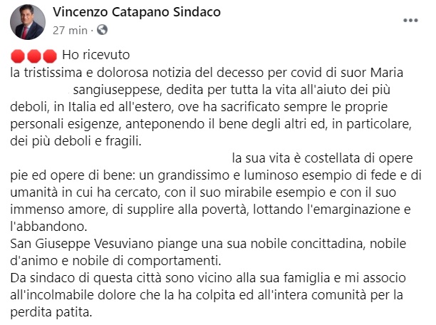 "Ho ricevuto ... la tristissima e dolorosa notizia del decesso per covid di suor Maria ... sangiuseppese, dedita per tutta la vita all'aiuto dei più deboli, in Italia ed all'estero, ove ha sacrificato sempre le proprie personali esigenze, anteponendo il bene degli altri ed, in particolare, dei più deboli e fragili. ... la sua vita- si legge nella nota- è costellata di opere pie ed opere di bene: un grandissimo e luminoso esempio di fede e di umanità in cui ha cercato, con il suo mirabile esempio e con il suo immenso amore, di supplire alla povertà, lottando l'emarginazione e l'abbandono. San Giuseppe Vesuviano piange- si legge nella nota- una sua nobile concittadina, nobile d'animo e nobile di comportamenti. Da sindaco di questa città sono vicino alla sua famiglia e mi associo all'incolmabile dolore che la ha colpita ed all'intera comunità per la perdita patita"