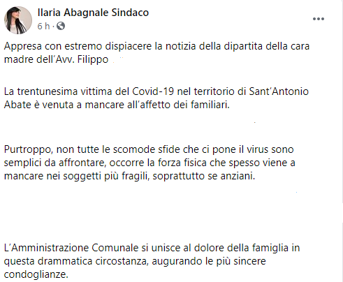 Questo il post pubblicato sulla sua pagina Facebook dal Sindaco di Sant'Antonio Abate Ilaria Abagnale: "Appresa con estremo dispiacere la notizia della dipartita della cara madre dell’Avv. Filippo (...). La trentunesima vittima del Covid-19 nel territorio di Sant’Antonio Abate (...). Purtroppo, non tutte le scomode sfide che ci pone il virus sono semplici da affrontare - si legge nel post - occorre la forza fisica che spesso viene a mancare nei soggetti più fragili, soprattutto se anziani (...). L’Amministrazione Comunale - conclude il post - si unisce al dolore della famiglia in questa drammatica circostanza, augurando le più sincere condoglianze".