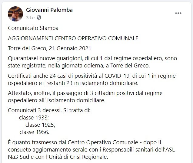 Questo quanto apprendiamo dalla pagina facebook del Sindaco di Torre del Greco: "Comunicato Stampa AGGIORNAMENTI CENTRO OPERATIVO COMUNALE Torre del Greco, 21 Gennaio 2021 Quarantasei nuove guarigioni - si legge nella nota -, di cui 1 dal regime ospedaliero, sono state registrate, nella giornata odierna, a Torre del Greco. Certificati anche 24 casi di positività al COVID-19, di cui 1 in regime ospedaliero e i restanti 23 in isolamento domiciliare. Attestato, inoltre, il passaggio di 3 cittadini positivi dal regime ospedaliero all'isolamento domiciliare - si legge nella nota -. Comunicati 3 decessi. Si tratta di: ... classe 1933; ... classe 1925; ... classe 1956. È quanto trasmesso dal Centro Operativo Comunale - dopo il consueto aggiornamento serale con i Responsabili sanitari dell’ASL Na3 Sud - si legge nella nota - e con l’Unità di Crisi Regionale."