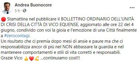 Questo il post pubblicato sulla pagina Facebook di Andrea Buonocore, Sindaco di Vico Equense. "Stamattina nel pubblicare il BOLLETTINO ORDINARIO DELL'UNITÀ DI CRISI DELLA CITTÀ DI VICO EQUENSE, aggiornato alle ore 22 del 4 giugno, condivido con voi la gioia e l'emozione di una Città finalmente a zero contagi. Un risultato - prosegue il post - che ci premia dopo mesi di ansie e paure ma che ci responsabilizza ancor di più nel NON abbassare la guardia e nel mantenere comportamenti e stili di vita corretti e responsabili. Grazie Vico...continuiamo cosi!!!".