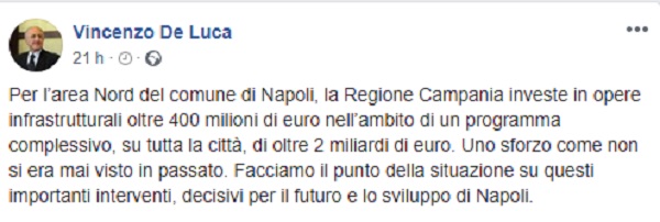 Questo il post e il video pubblicati sulla pagina fb ufficiale del Presidente della Regione Campania Vincenzo De Luca.