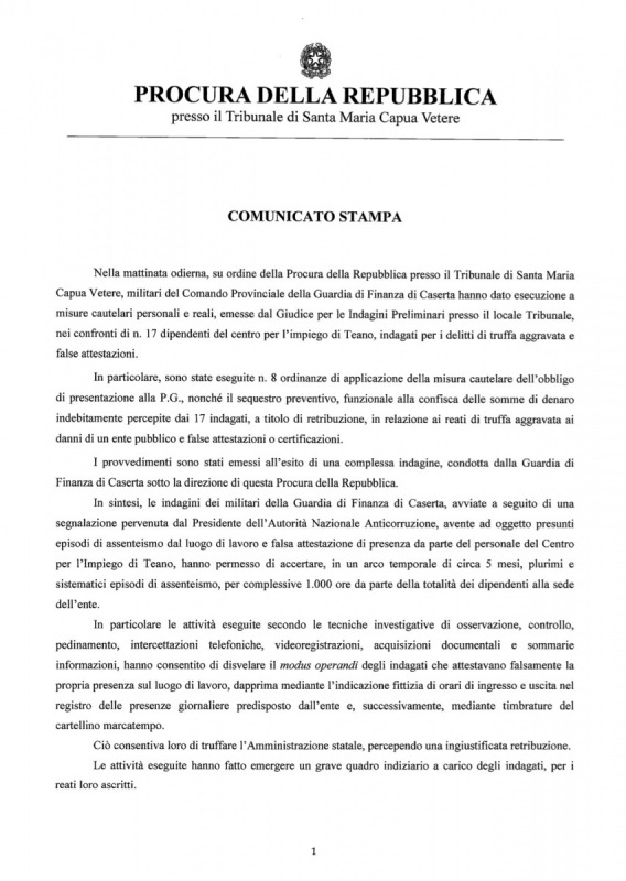 VIDEO. TEANO. Procura SMCV: "17 dipendenti del Centro per l'Impiego indagati per i delitti di truffa aggravata e false attestazioni"