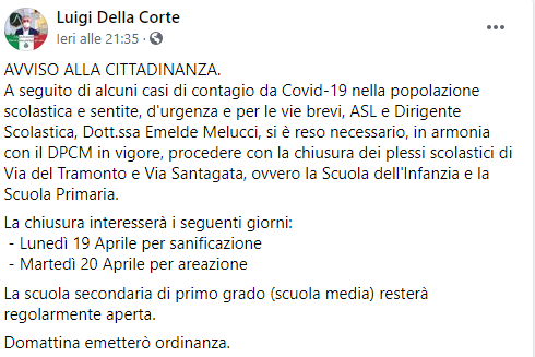 Questo il post pubblicato dal Sindaco di Villa di Briano Luigi Della Corte sulla sua pagina Facebook: "Avviso alla cittadinanza. A seguito di alcuni casi di contagio da Covid-19 nella popolazione scolastica e sentite, d'urgenza e per le vie brevi, ASL e Dirigente Scolastica, Dott.ssa Emelde Melucci, si è reso necessario - prosegue il post - in armonia con il DPCM in vigore, procedere con la chiusura dei plessi scolastici di Via del Tramonto e Via Santagata, ovvero la Scuola dell'Infanzia e la Scuola Primaria. La chiusura interesserà i seguenti giorni: - Lunedì 19 Aprile per sanificazione - Martedì 20 Aprile per areazione. La scuola secondaria di primo grado (scuola media) resterà regolarmente aperta. Domattina - conclude il post - emetterò ordinanza".