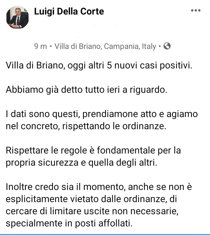 Lo apprendiamo dalla pagina Facebook del Sindaco di Villa di Briano Luigi Della Corte