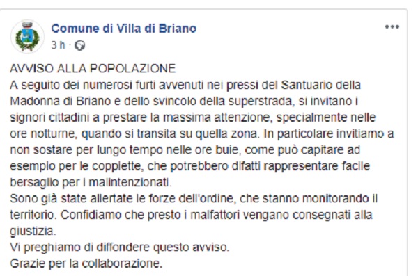 Questo il post pubblicato sulla pagina fb ufficiale del Comune di Villa di Briano
