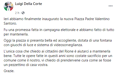 Questo il post pubblicato sulla sua pagina Facebook dal Sindaco Luigi Della Corte di Villa di Briano: "Ieri abbiamo finalmente inaugurato la nuova Piazza Padre Valentino Santoro. Fu una promessa fatta - si legge nel post - in campagna elettorale e abbiamo fatto di tutto per mantenerla. Oggi la piazza - prosegue il post - si presenta bella ed accogliente, dotata di una fontana con giuochi di luce e sistema di videosorveglianza. L'unica cosa che chiedo ai cittadini - prosegue il post - del Rione è aiutarci a mantenerla bene. Tutte le opere fatte in questi anni sono costate sacrificio per un comune come il nostro, vi chiedo di prendervene cura come se fosse un pezzettino di casa vostra. Grazie".