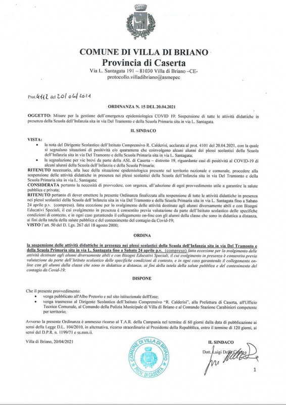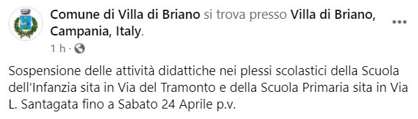 Questo quanto pubblicato sulla pagina fb del Comune di Villa di Briano: "Sospensione delle attività didattiche nei plessi scolastici della Scuola dell'Infanzia sita in Via del Tramonto - si legge nella nota - e della Scuola Primaria sita in Via L. Santagata fino a Sabato 24 Aprile p.v."