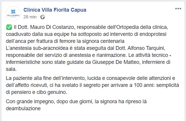 Questo quanto comunicato dalla Clinica Villa Fiorita di Capua