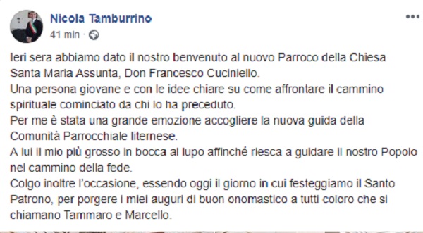 Questo il post pubblicato dal Sindaco di Villa Literno Nicola Tamburrino.