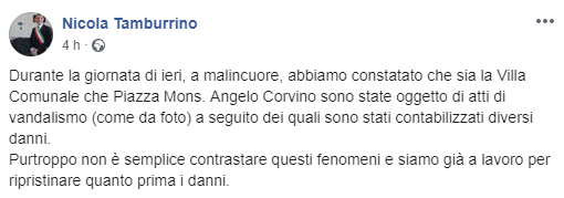 Questo il post pubblicato su Facebook dal Sindaco di Villa Literno Nicola Tamburrino: